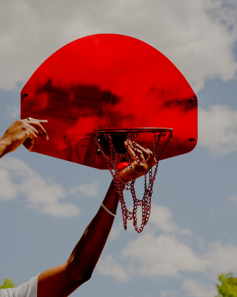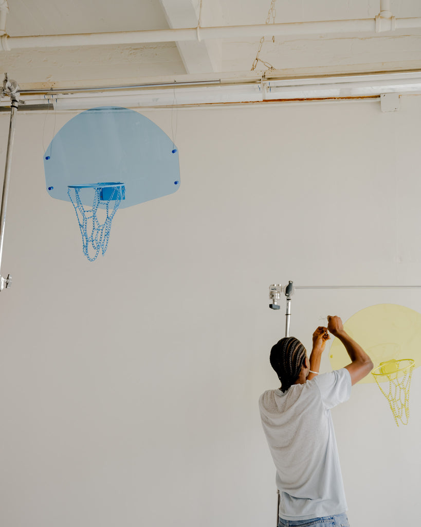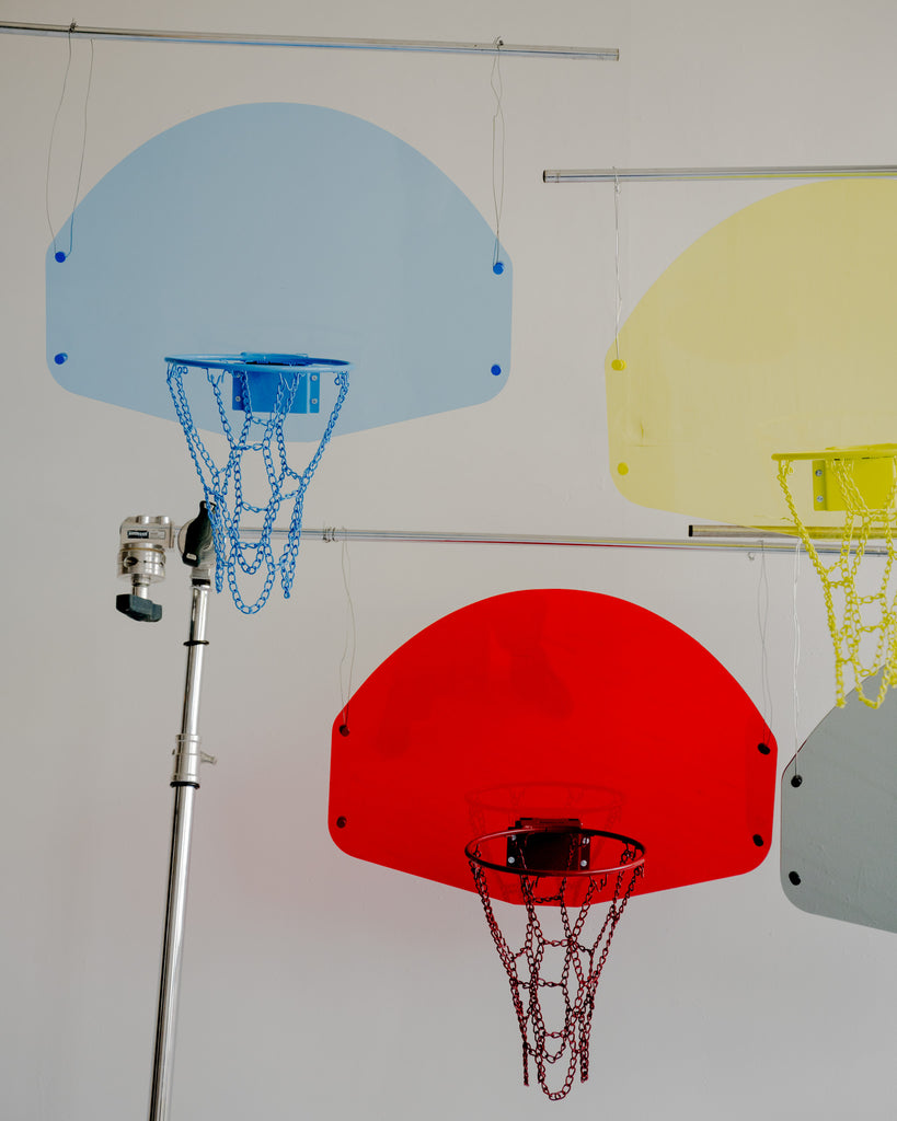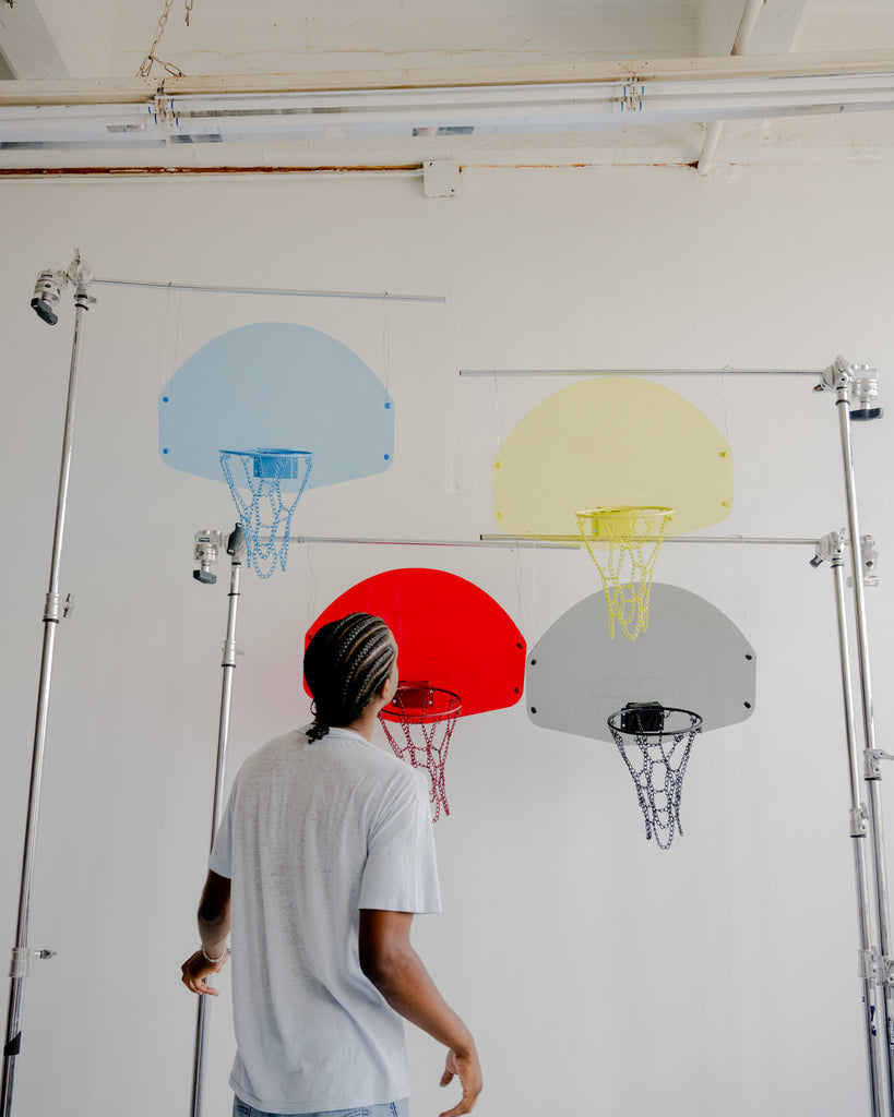 Volume 3 introduces our signature shell-shaped basketball hoop in bold colored acrylicsavailable in black, blue, yellow, and red. Each hoop features a Cuban link chain net and a sculptural backboard that blends design, material, and function.